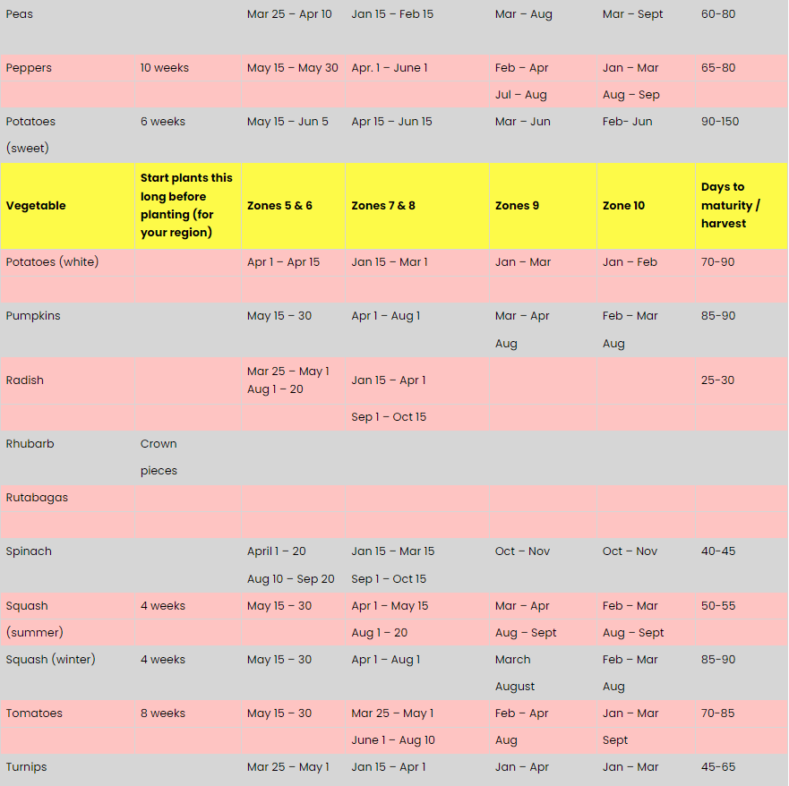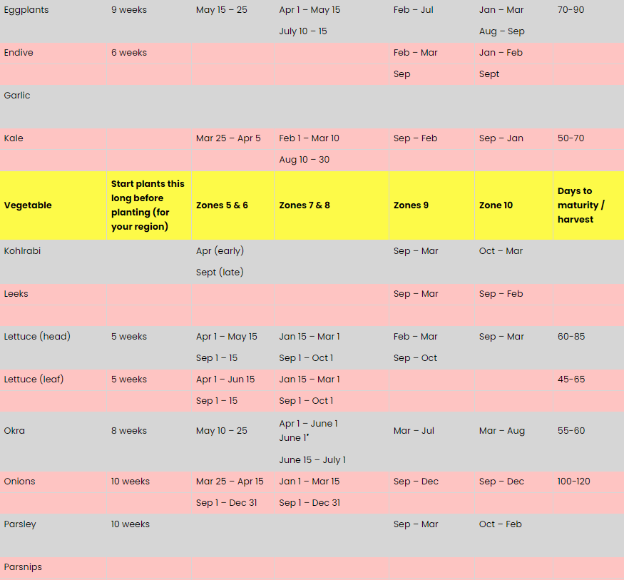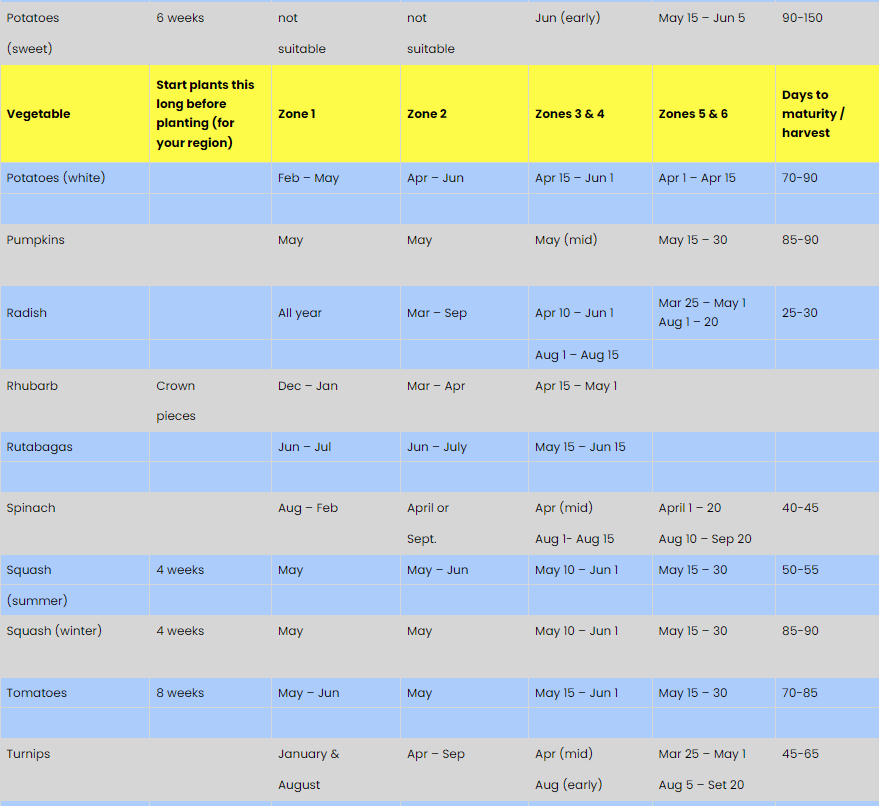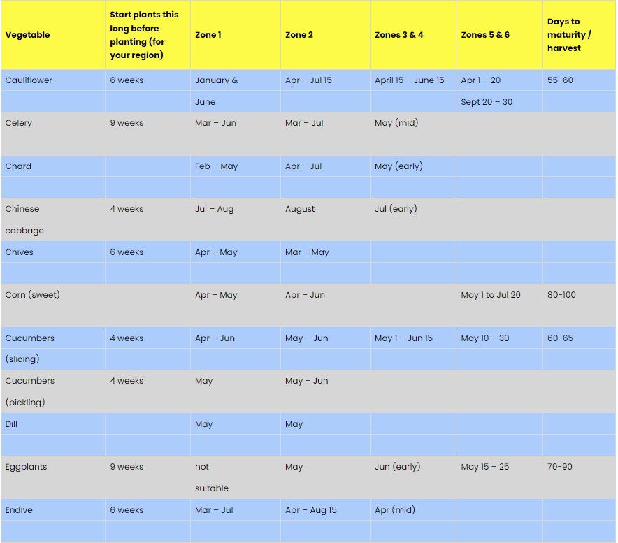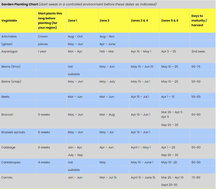 Vegetable and Herb Planting Schedule: USDA Zones 1-6
