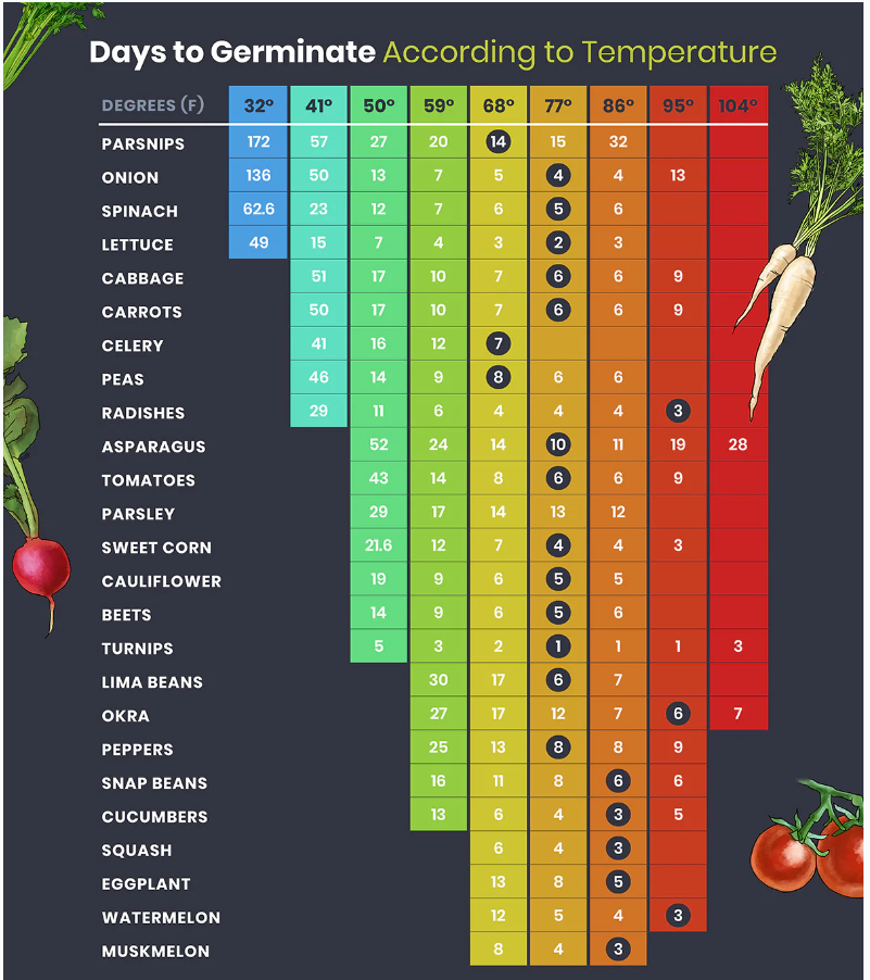 Seed Germination versus Temperature: (use the table below to ensure your seeds stay on schedule!)