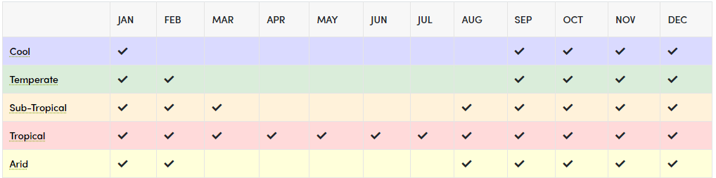 Use the table below to identify the best time of year to sow Malabar spinach seeds in your climate.
