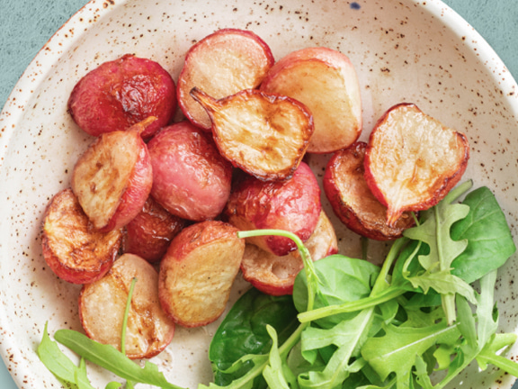 3.Add the cherry radish slices to the dressing and place on a baking sheet.