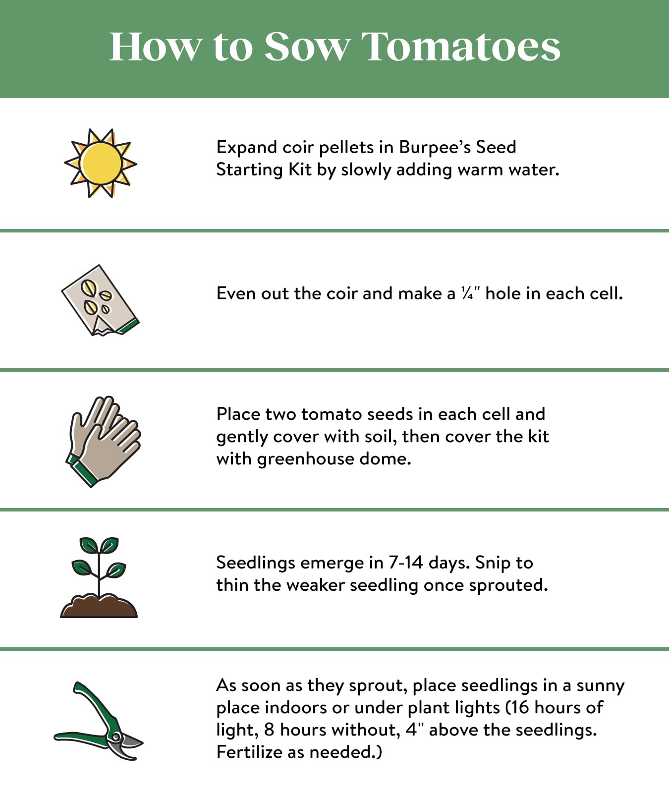 SEED STARTING TIP: Sow tomato seeds indoors 6-8 weeks before average last frost date using our seed starting kit. Transplant seedlings into your home garden after after all the risk of hard frost has passed. Make sure to harden off your tomato seedlings by leaving them outdoors in their containers up to a week before transplanting. Plant Height is 48-60"; spread is 18".