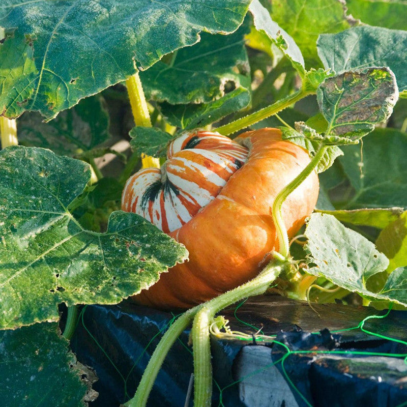 Turk's Turban Squash is a distinguished winter squash with a smooth colorful hat-like structure wrapped above a striped curved fruit. Like a colorful Middle-Eastern Turban, Turk's Turban has a deep orange base color with a mottling of yellow, white, and dark green splotches and striations. A beautiful display of Fall colors in the most unique pumpkin shape. The flesh inside is pale yellow and the flavor of turban squash is mild and slightly nutty, with a soft, floury texture.