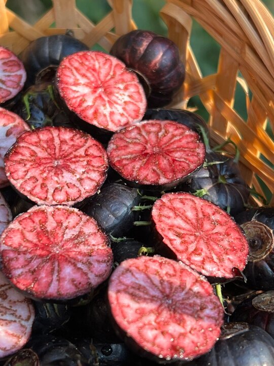 Welcome to the enchanting realm of Red Berry Ginseng! Cloaked in a mysterious deep purple hue, adorned with a crown of "legs" resembling lush green needles, it's fondly known as the "Spider Fruit." Despite its peculiar appearance, slicing it open reveals a stunning sight: vibrant red flesh, crisp yet succulent, bursting with a delightful blend of sweetness and tartness, accompanied by a refreshing herbal fragrance.