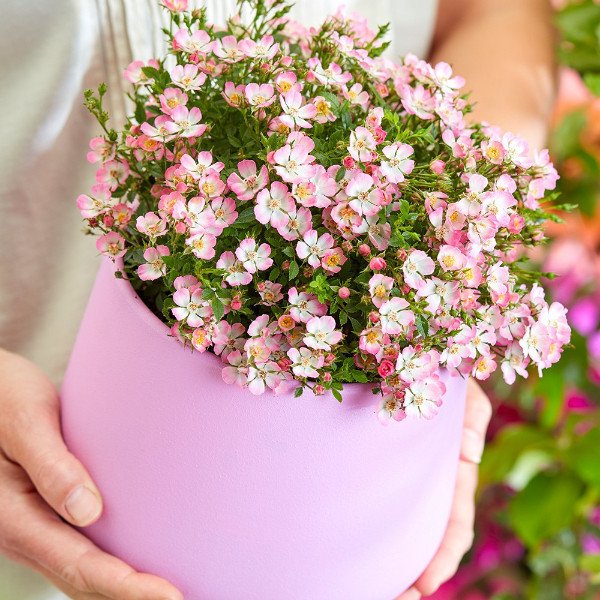 The alpine rose Cutie Pie is definitely "cute"! This sweet, small, heavily scented rose stays short and compact, growing to around 10-20cm tall and 30cm wide. This makes it ideal for pots and for the edges of beds and borders, where its lush flowers can be admired for many months. Since it does not produce any fruit, no pruning is required. In addition, this miniature rose has no thorns, which is another very important advantage. The bee-friendly alpine rose Cutie Pie blooms profusely in summer with delightful, delicately scented, pink-white to pink flowers and is an asset to your garden, patio and balcony. Despite all this cuteness, the miniature rose is robust and extremely hardy down to -25º C. It even survives dry periods in summer unscathed.