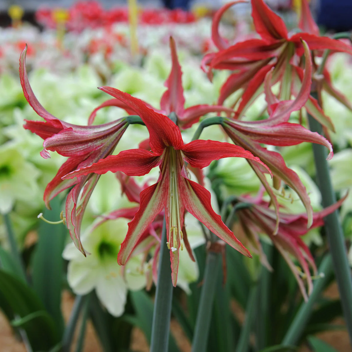 Amaryllis 'Sumatra' is truly graceful and eye-catching with salmon-pink to deep orange, spidery petals contrasting with the elongated, white stamens. Floriferous, with stout scapes and long-lasting blooms, up to 6 in. across (15 cm), it makes wonderful cut flowers.