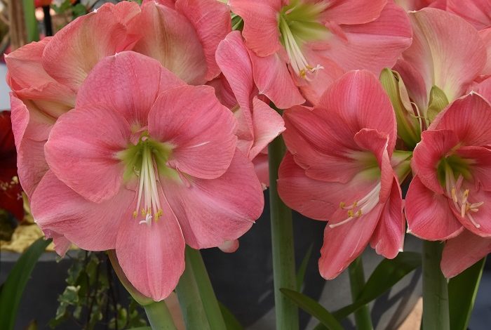 Amaryllis 'Susan' (Hippeastrum) is a ravishing variety with large, flat-faced flowers, up to 7 in. across (18 cm), brushed with pale rose-pink and adorned with a bright lime-green throat lined with a ring of red dots. The broad, rounded and overlapping petals display a lovely netted pattern.