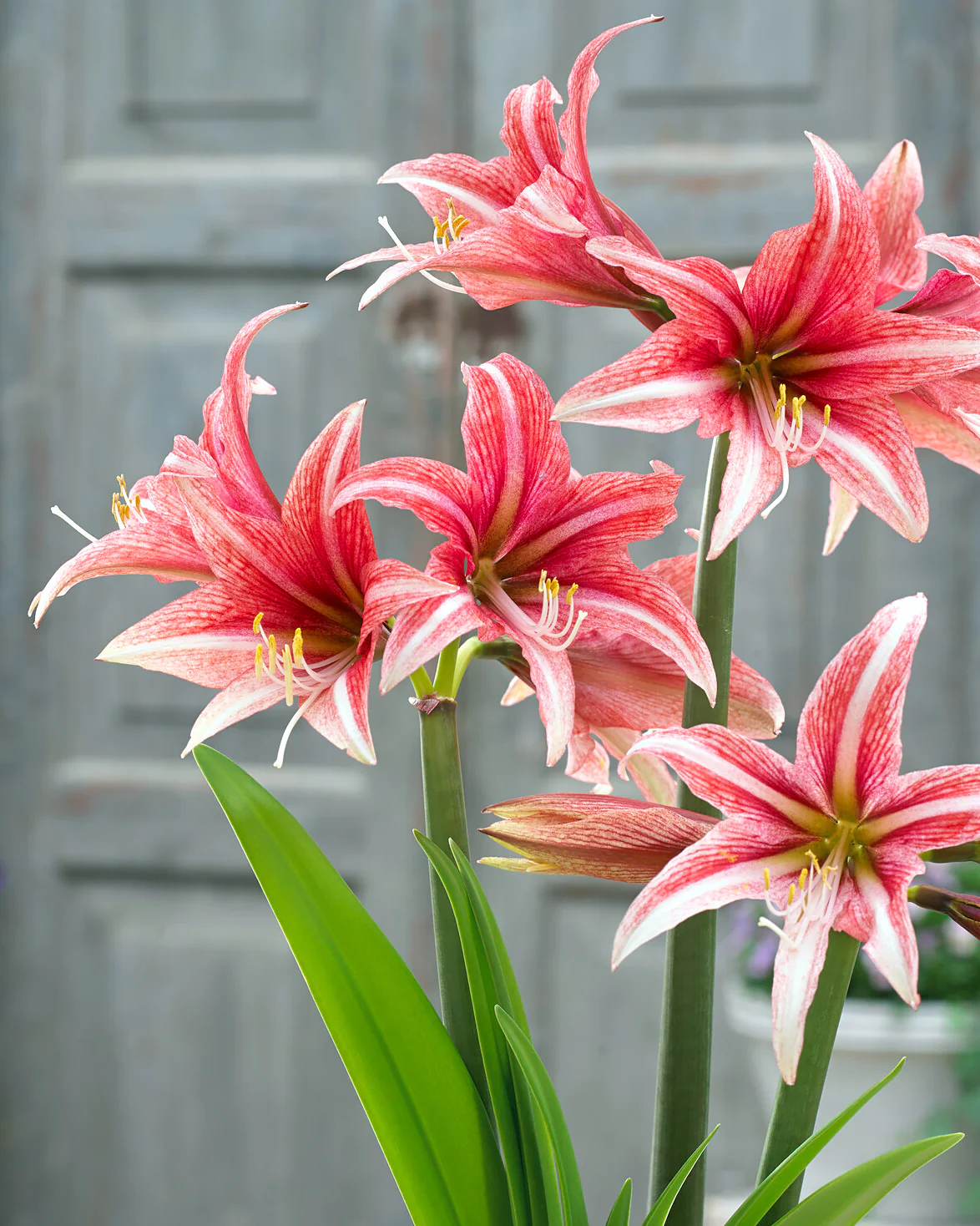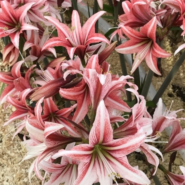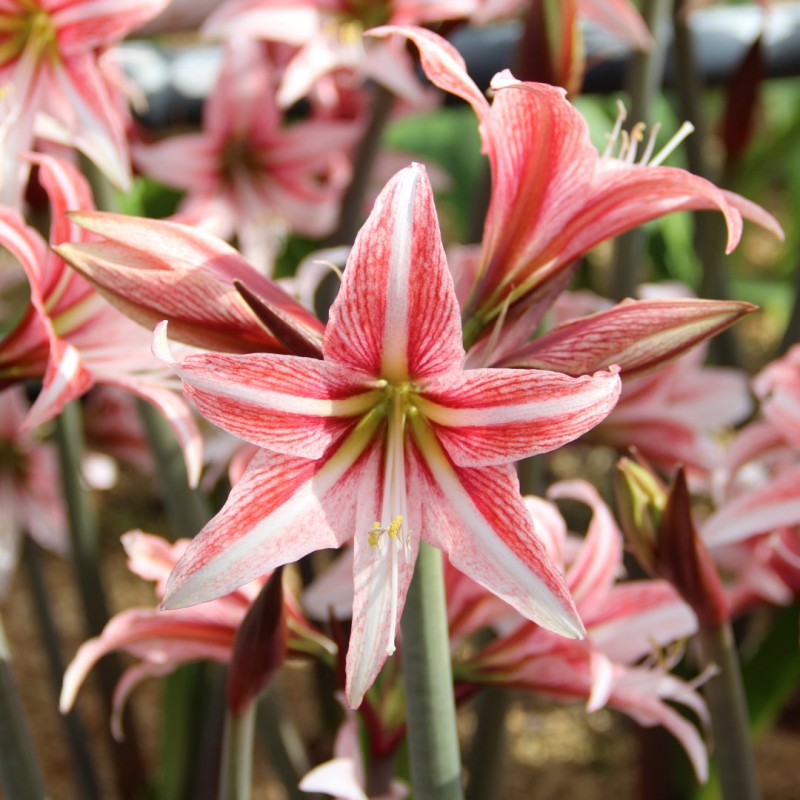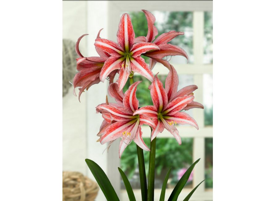Amaryllis 'Sweet Lillian' (Hippeastrum) is very pretty with its star-shaped, rosy-pink flowers, up to 6 in. across (15 cm), delicately fading to white towards their tips and adorned with white center stripes and an apple-green throat.