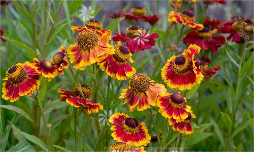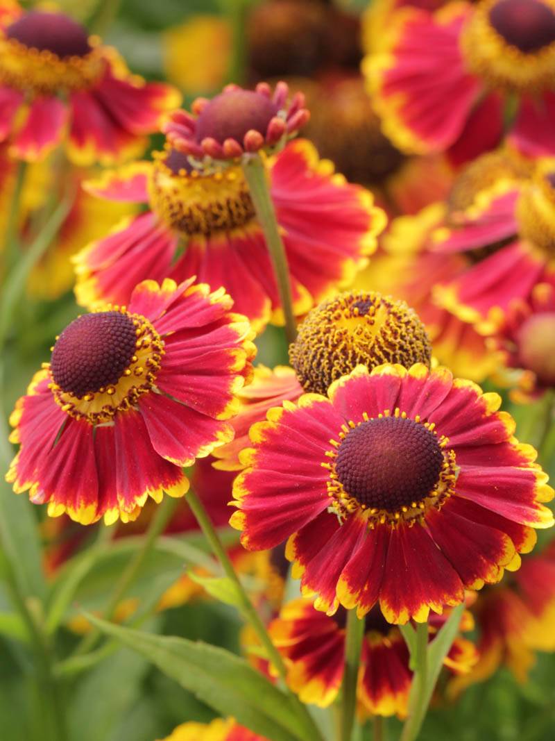 Helenium 'Biedermeier' produces eye-catching flowers, 2 in. wide (5 cm), with bright red petals, each adorned with a rich golden-yellow edge. They surround a dark brown cone covered with golden pollen that attracts butterflies. Slightly drooping when they appear, the petals tend to droop even more as the flowers mature. The blossoms are elegantly borne on purple stems atop a foliage of lanceolate, mid green leaves, and add a boost of fresh energy in the late summer garden.