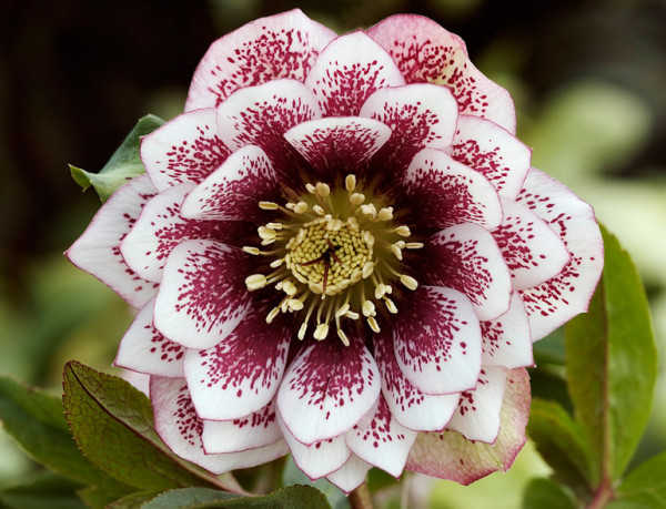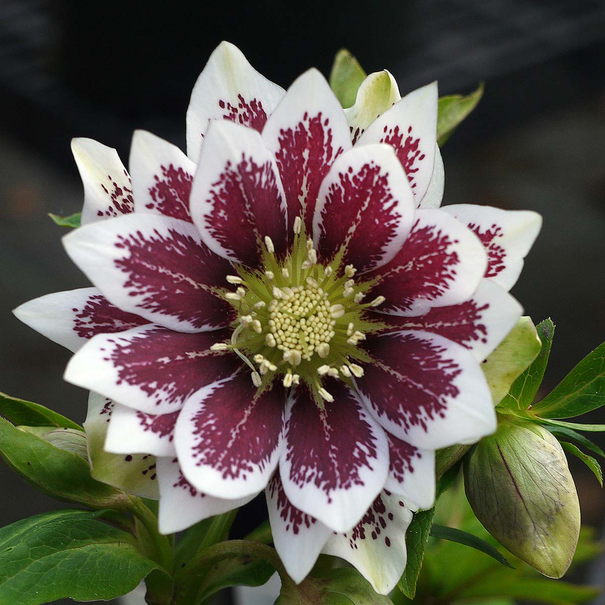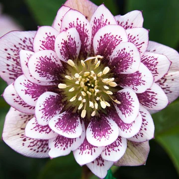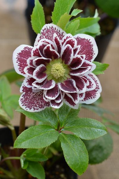 Lenten Rose is an early-blooming perennial with some of the showiest flowers. Even after the blooms fade, the lush greenery provides color and vitality to a space. Shotgun Wedding Lenten Rose has 3-inch wide double flowers. The petals come to a gentle point and feature saturated burgundy spots with crisp white along the margins. This Helleborus hybrid blooms in early spring, making it one of the season's first flowers.