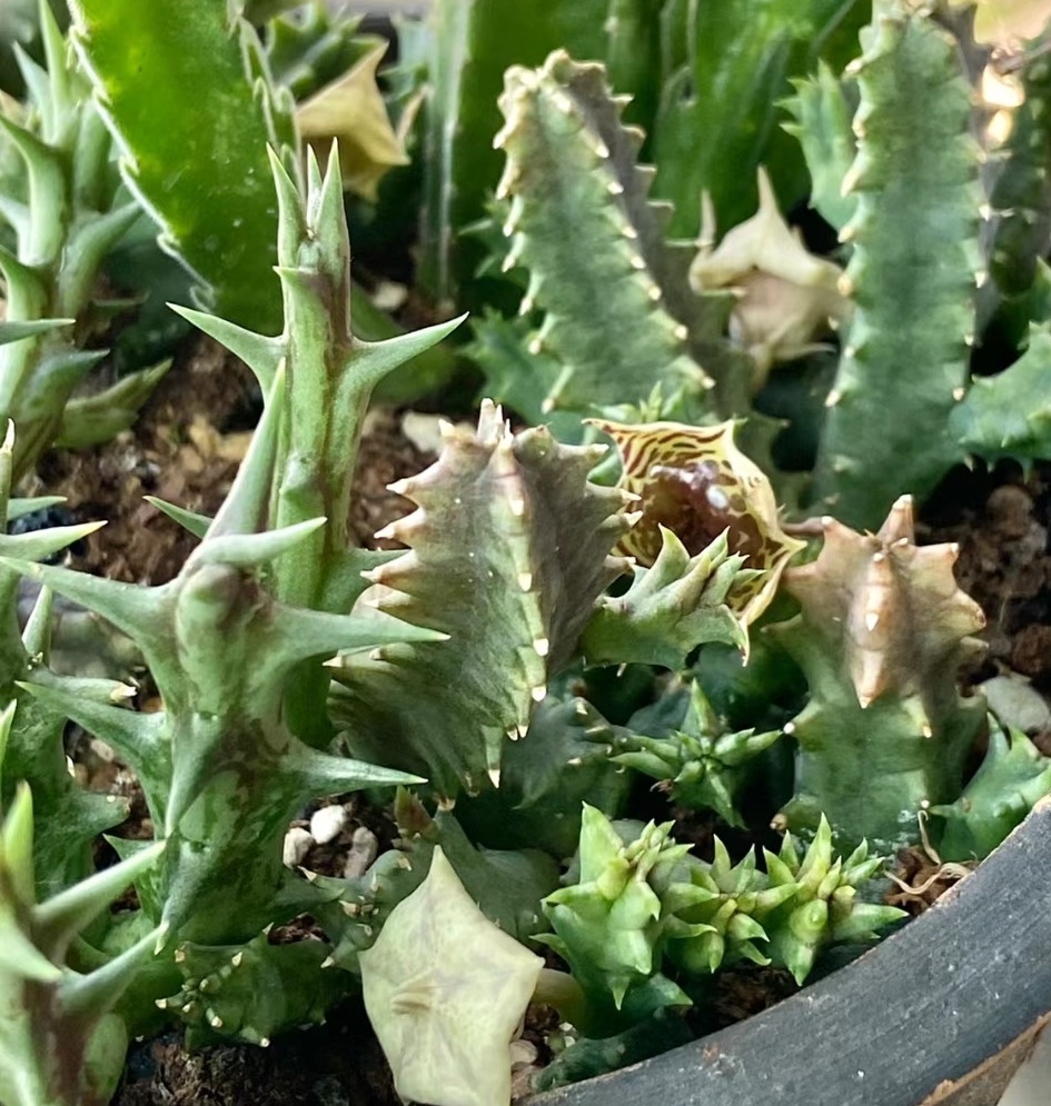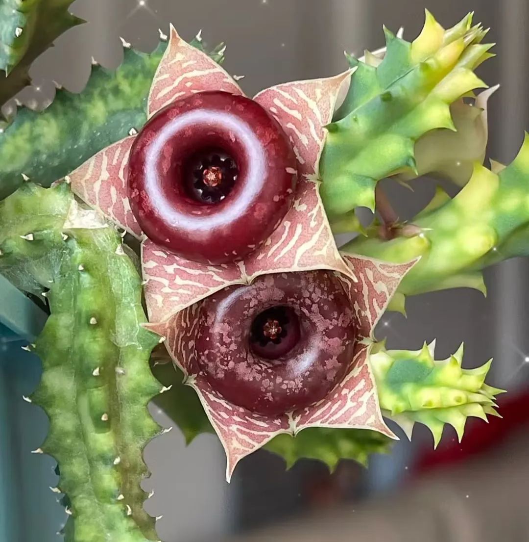 Huernia zebrina (a.k.a. Owl eyes) is a low-growing perennial succulent species more or less creeping, occasionally forming mats. It is one of the most beautifully flowering huernias and very popular in cultivation for its odd blooms. It has a raised, glossy, wine-red ring or 'annulus' around the mouth of the corolla tube. The corolla varies in size and is usually patterned with wine-red zebra stripes which vary conspicuously in colour intensity. One of the so-called “lifebuoy” huernias because of the glossy raised annulus.