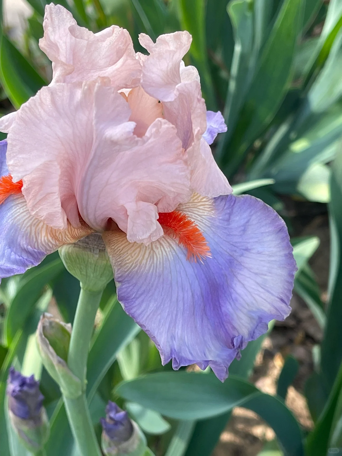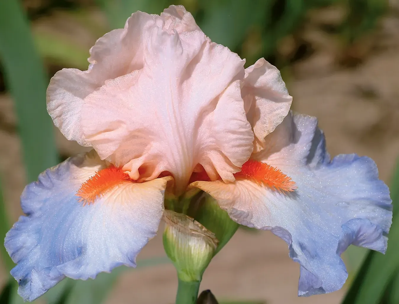 French Cancan's standards are very light pink. The lower petals have a bluish lavender color, while the upper petals surprise with a delicate shade of pink turning into apricot. The upper portions of the light lavender-blue falls are colored with the same light pink, really drawing attention to the prominent bright red/orange beards.