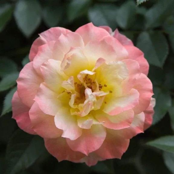 Similar to 'Peace' in its coloration, the orange buds of Italian Ice rose open to soft yellow flowers melting into pink blushed margins. The soft flower color is set off nicely by its dark green, glossy foliage. Flowers are semi-doubled, with 24-30 petals per bloom. This self-cleaning rose has excellent disease-resistance, abundant flowers, and a nice habit, making it an excellent plant for home gardens.