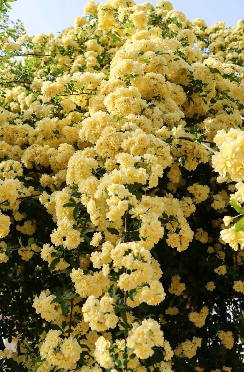 Lady Banks' Rose is known for its delicate and abundant blooms that come in shades of white,red or yellow.The flowers of Lady Banks' Rose are typically small, measuring about 1 to 1.5 inches (2.5 to 3.8 cm) in diameter.They are arranged in clusters, creating a profusion of blooms that contribute to the plant's ornamental appeal.