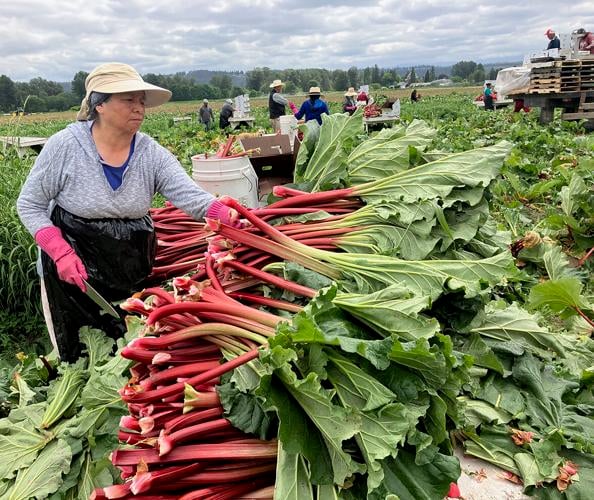 The stalks are the only edible part of the rhubarb plant. These have a rich, tart flavor when cooked. The leaves of the rhubarb plant are toxic. They contain an irritant called oxalic acid, so be sure that they are not ingested.