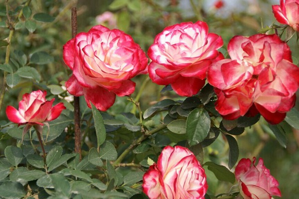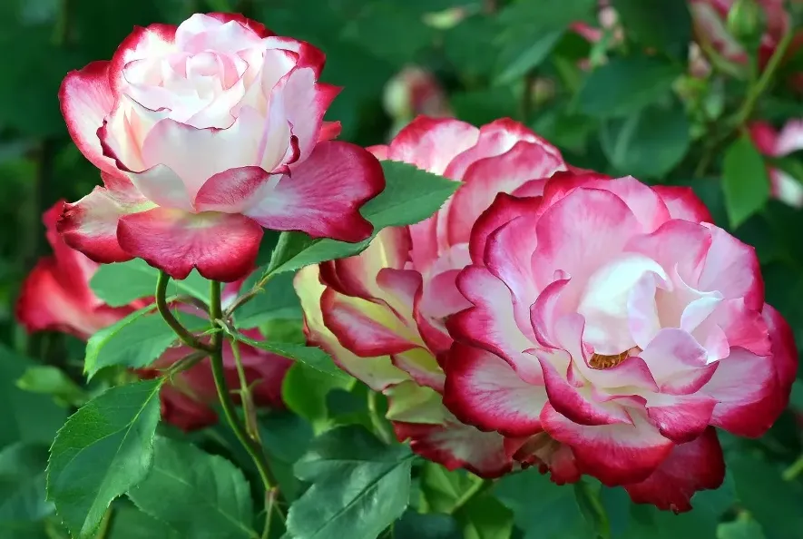 Free-flowering, Rosa Cherry Parfait is an exquisite Grandiflora rose with abundant clusters of large, 4 in. across (10 cm), full (35-40 petals), cupped-to-flat, white flowers adorned with vermilion edges. Opening from elegant pointed buds, the blossoms have a mild, sweet fragrance and bloom almost continuously from spring to fall. The bicolor flowers stand out against the lush foliage of dark green leaves. A compact, bushy, nicely rounded shrub rose that is heat tolerant and disease resistant. Perfect for beds, borders, or as a flowering hedge.