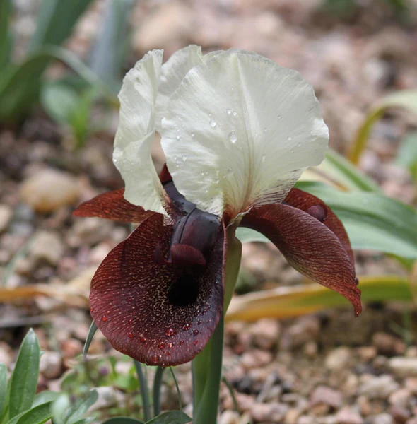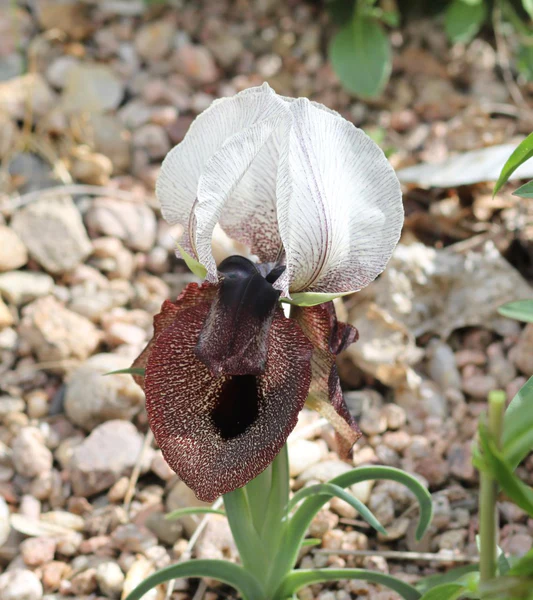 Iris iberica is a plant species in the genus Iris, it is also in the subgenus Iris and in the section Oncocyclus. It is a rhizomatous perennial, from the Caucasus mountains of Armenia, eastern Georgia, and western Azerbaijan. It has narrow, glaucous, gray-green and sickle shaped leaves, short stem holding a single flower in late spring. Which has a pale background (white, cream or pale blue) covered with heavy veining in pale mauve, violet, dark purple, maroon or purple-brown. It has a black or dark purple signal patch and a brown or purple-brown beard. Although, it has many hybrid forms dues to its variability and has 2 known subspecies of Iris iberica subsp. elegantissima and Iris iberica subsp. lycotis. It is cultivated as an ornamental plant in temperate regions, as it is hardier than other Oncocyclus species. It is similar to Iris susiana, apart from its leaf and flower form.It is classed as an Mezo-xerophyte,(meaning they like intermediate dry conditions.) or xeric species (similar to Seseli grandivittatum, Thymus tiflisiensis, Scorzonera eriosperma and Tulipa eichleri). It has a slender, and compact rhizome, that is not stoloniferous, but up to 1.5 cm in diameter. They have 4–6 leaves, that are glaucous, grey-green,and falcate, (sickle shaped) or curved.They can grow up to between 7.5–15 cm (3–6 in) long, and are narrow, being between 0.2 and 0.6 cm wide. The leaves start to grow in Autumn (near to September), after a summer rest period after flowering. It has a short, slender stem or peduncle, that can grow up to between 15–20 cm (6–8 in) tall. The stem has a green, lanceolate, membranous, spathes (leaves of the flower bud), which are variable is size, between 3mm, to 5 cm long. The stems hold a solitary, terminal (top of stem) flower, blooming in late spring, between March and May. In the UK, it blooms later between May and June: 192  The flowers can last between 120 and 145 days before fading. The flowers are 10–15 cm (4–6 in) in diameter, they are described as big and flouncy. The very variable, bi-coloured flowers,have a white, silvery white cream,or pale bluish background,with heavily stippled, spotted or veined in pale mauve, violet, dark purple, maroon, or purple-brown.Some forms can have a lilac background.