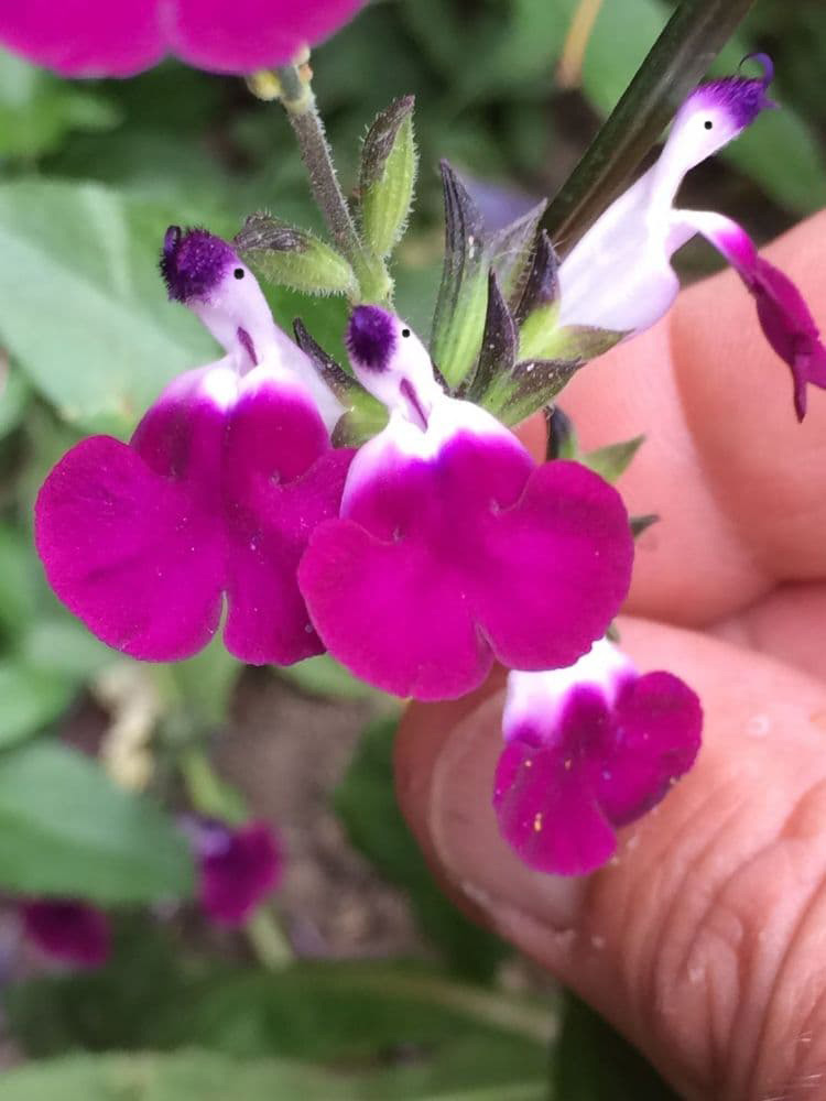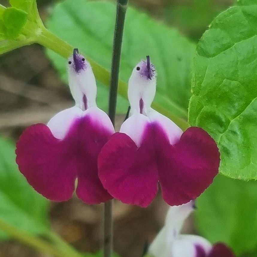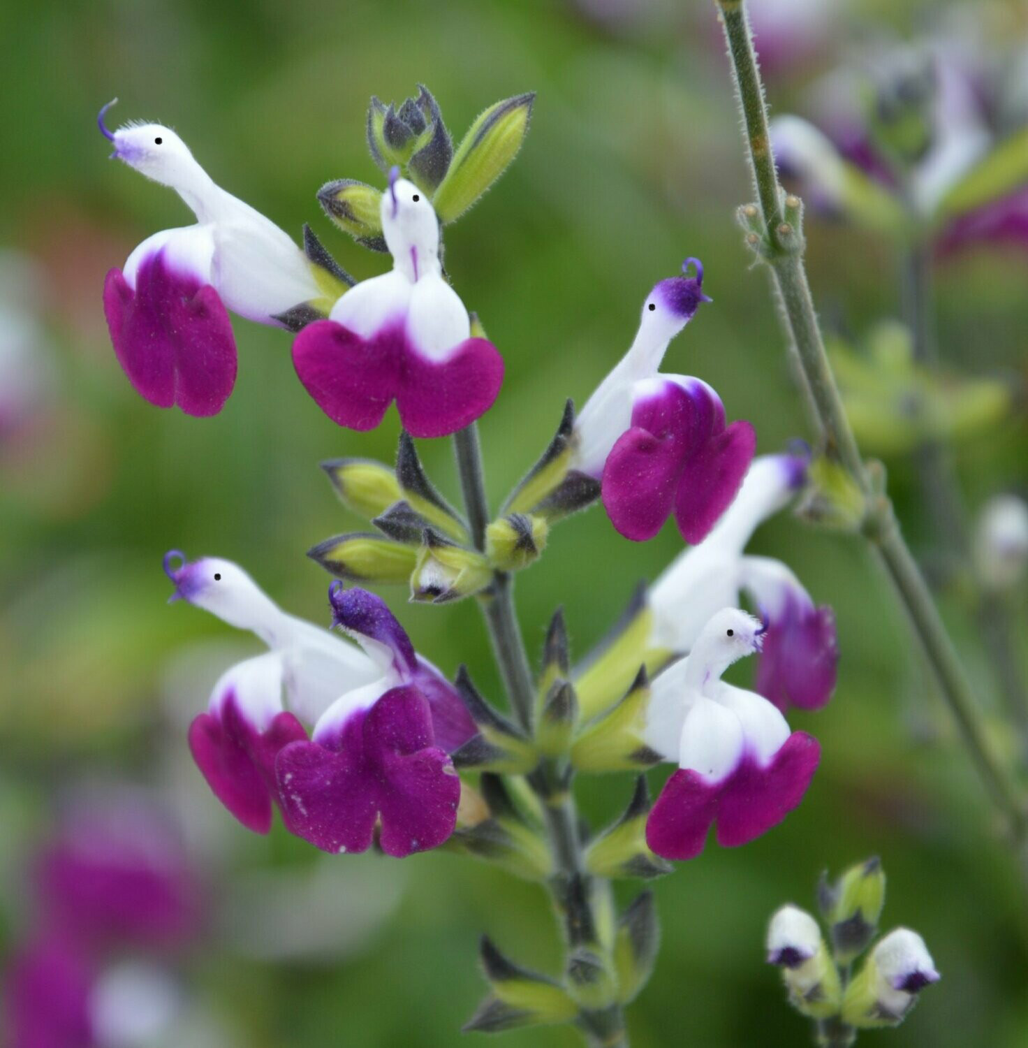 Salvia Greggii Amethyst Lips Autumn Sage is a perennial with a low clumping habit that grows best in full sun and prefers well-drained soil with moderate water. It showcases lime-green leaves with a blackcurrant aroma, and wine-purple and white flowers bloom from spring to early autumn. Amethyst Lips Autumn Sage can be used for borders, beds, and containers.