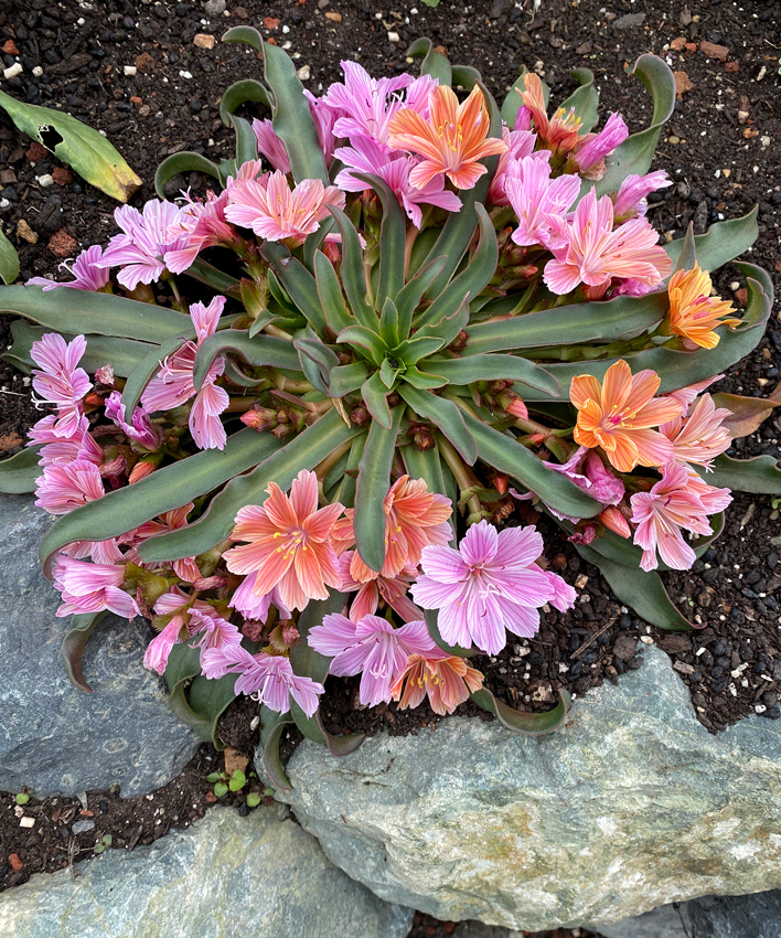 Gorgeous in flower, this perennial jewel of the Pacific Northwest is also extremely hardy, long blooming and low maintenance if you provide it with a happy home. From a burst of bloom in May, it delivers a succession of flower clusters to September in a radiant range of sunset colors such as apricot, pink, tangerine, yellow, and occasionally white. The 1” flowers are held on sturdy 6” stems in radiating clusters above an attractive succulent green 5” rosette that develops into a considerable mound with time. Deeply tap-rooted, Lewisia benefits from some dryness, so plant in a clay pot with some gravel added or stick them in the cracks of a rock wall (they love that). That’s not asking much, eh?
