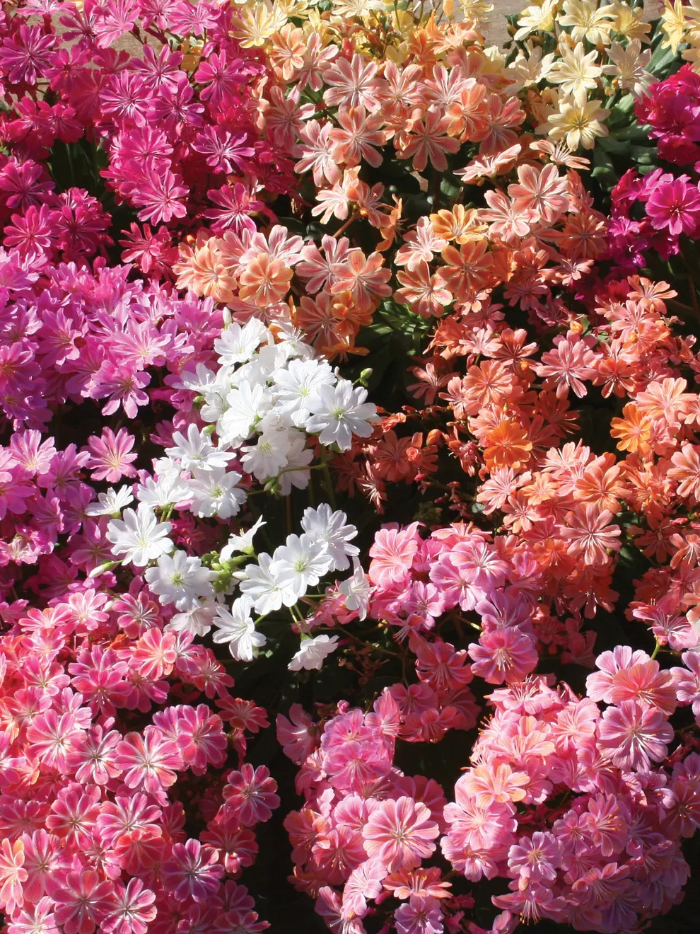 Lewisia cotyledon ‘Rainbow’, with its lovely fragrance, presents an explosion of color that is sure to impress. Evergreen rosettes of succulent foliage each display one color of blooms randomly chosen from a myriad of options, including showy orange, purple, yellow, white and hot pink.