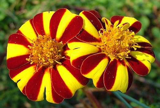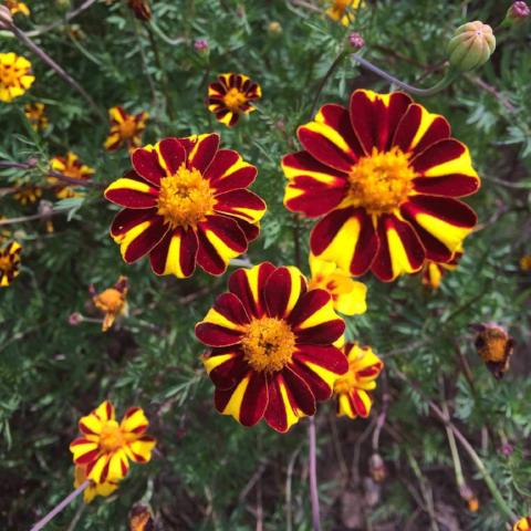 About- Beautiful bi-color French marigold with a pinwheel pattern of maroon and yellow petals. Great for adding interesting color and attracting pollinators to your garden.