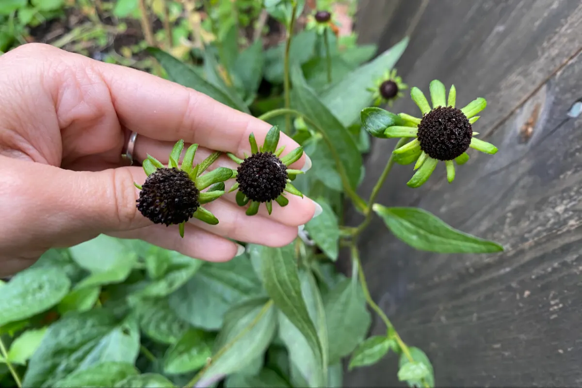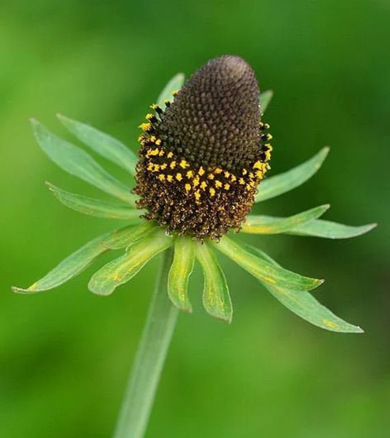 Looking like a plucked daisy, this Rudbeckia sports long, thin green sepals and a giant, pointy deep purple to black cone (the size and shape of a large strawberry)! Wonderfully attention-getting in the garden, 'Green Wizard' is also welcome as an Everlasting, where its ultra-strong stems support these stylish cones for months on end, adding interesting texture and tall vertical effect to bouquets, centerpieces, and decorations of all types.