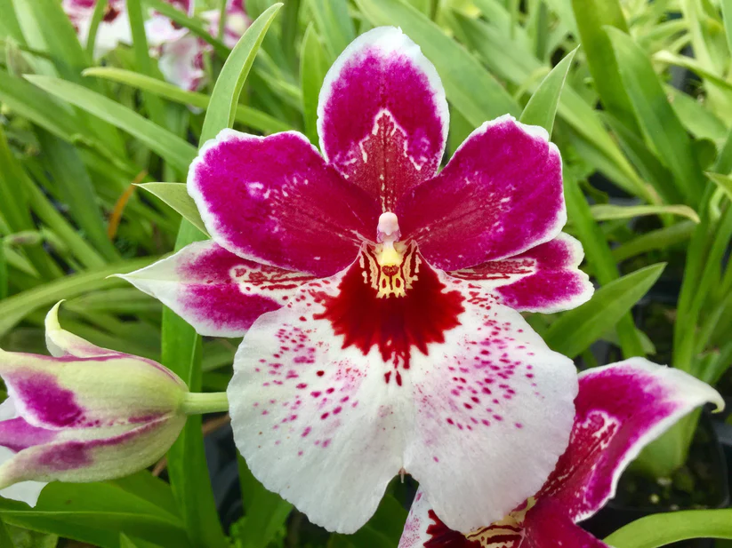 This is Miltoniopsis Breathless 'Florence', an orchid that will put out beautiful dark red flowers, with a white waterfall lip, blending into a yellow center.