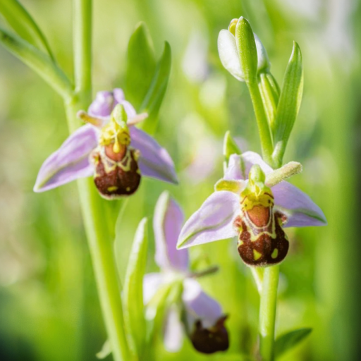 People who have never seen a bee orchid in the wild have a treat in store. Each flower is perfection in miniature. Colour is provided by three prominent, triangular sepals in a rich blancmange pink. But it is the lowest of three petals where the action takes place, for this is enlarged into a lip. The fuzzy, little bee orchid flowers look like real bees feeding on three pink petals. This is one of nature’s clever tricks, as bees visit the plant in hopes of mating with the little faux bees. This bit of bee orchid mimicry ensures the plant is pollinated, as the male bees transfer the pollen to nearby female plants. The sweet aroma doesn’t hurt either when it comes to attracting amorous pollinators.